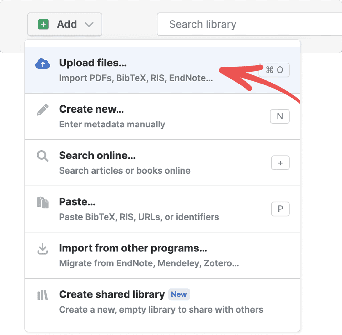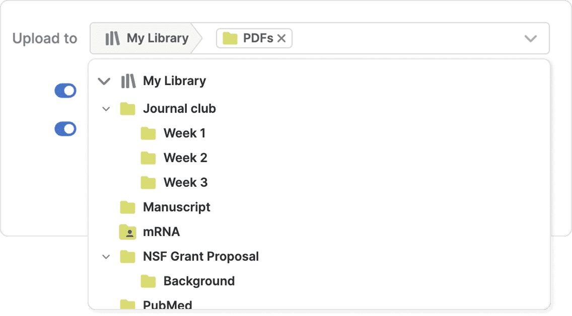 }To upload bibliographic files and PDFs from other reference managers, see Migrate from other products.