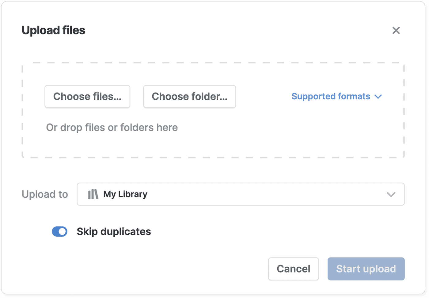 If the option Skip duplicates is turned on, any files that you try to upload that already exist will be skipped and not imported. This option is on by default.