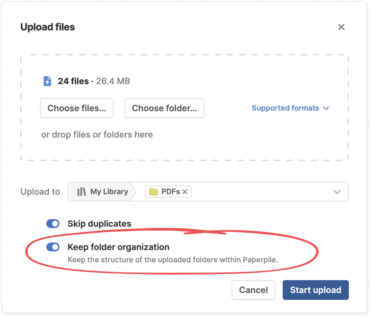 When you upload a folder of PDFs with subfolders, Paperpile can recreate this structure in your library. Simply select the Keep folder organization option.