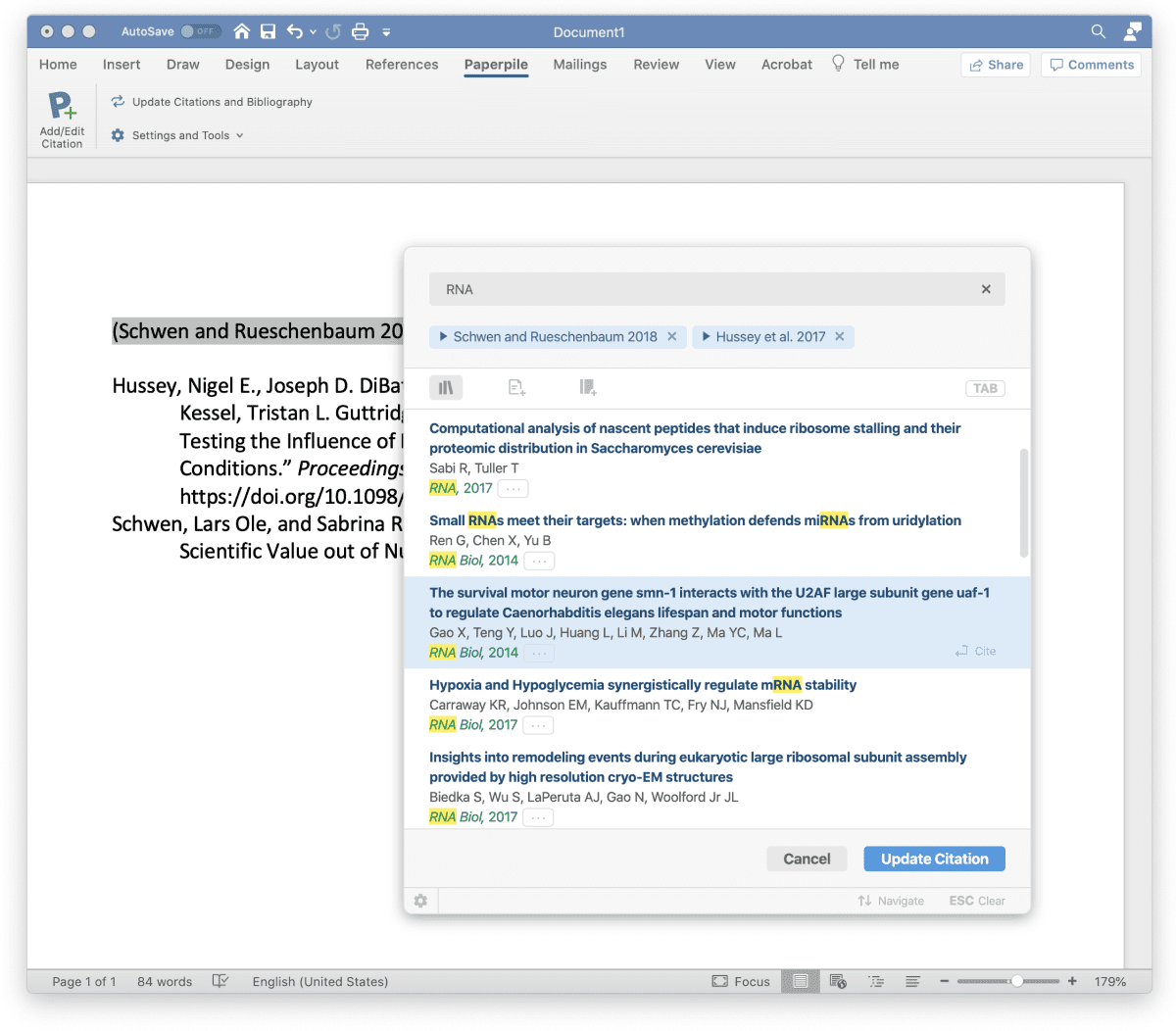 Although officially still in beta, our new Microsoft Word plugin is fully functional and already used by thousands of Paperpile users. Like our Google Docs plugin, we're working on a new version that better integrates with Paperpile's new features (such as shared libraries and folders) and adds many user-requested features.