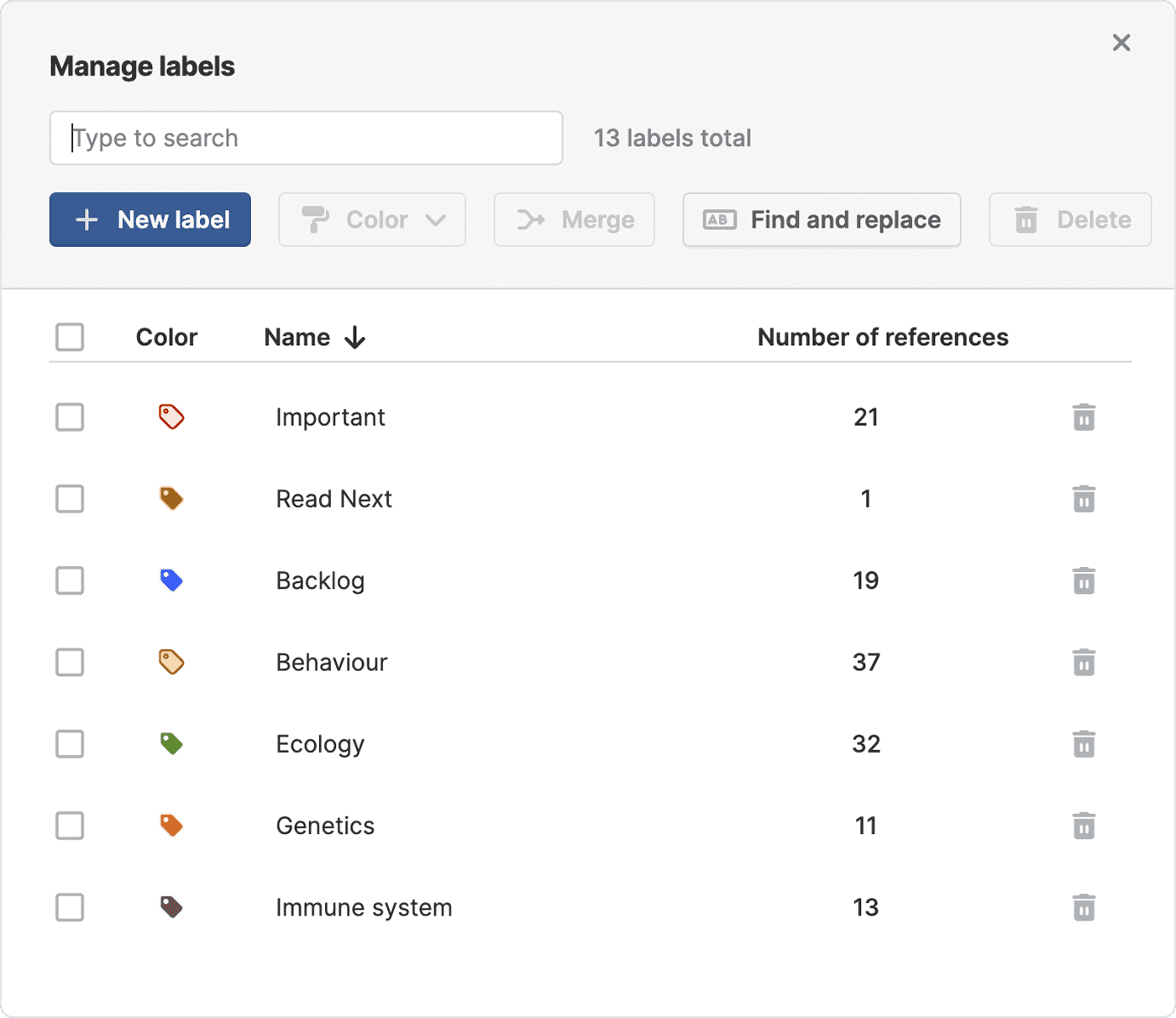 We are adding bulk actions for labels and folders to simplify large-scale library organization. You can delete multiple labels or folders at once, change label colors in bulk, rename labels and folders using search and replace, and merge labels to consolidate duplicates or overlapping categories.