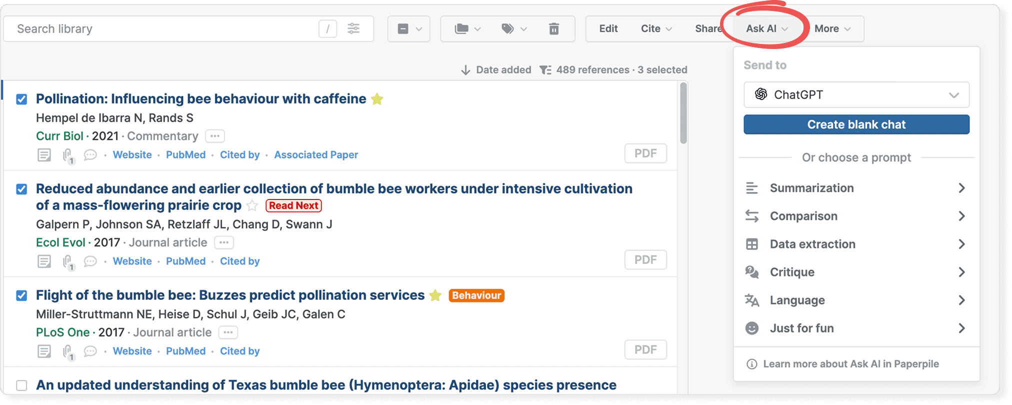 Connect your Paperpile library with your favorite AI assistants. Send PDFs directly to ChatGPT, Gemini, NotebookLM, Claude, and Copilot to summarize papers, extract key findings, or get answers to your research questions. Choose from a curated library of research-focused prompts designed to help you get better, more relevant results from AI tools.