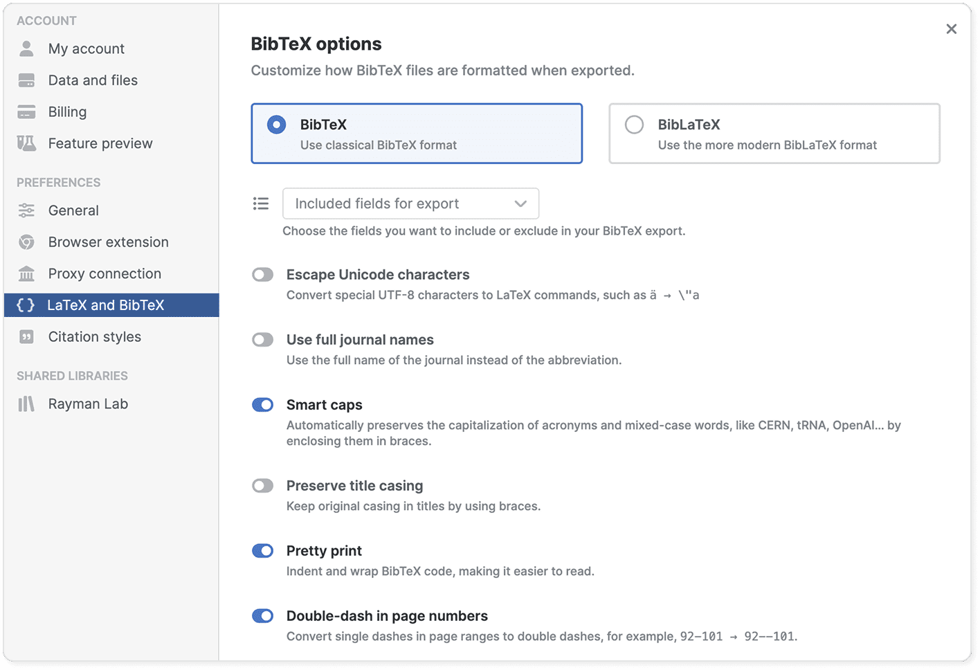 We are expanding and refining BibTeX export to support a wider range of workflows and journal requirements. This includes support for BibLaTeX, improved handling of UTF-8 character conversion to plain BibTeX, and more advanced controls over which fields are included in exports.